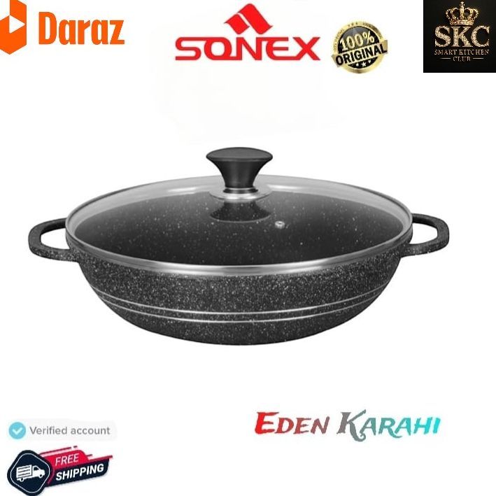 Original Sonex Eden Die Cast Karahi Ceramic Marble Coating Non Stick with Glass Lid 32cm | Premium Quality Cooking
