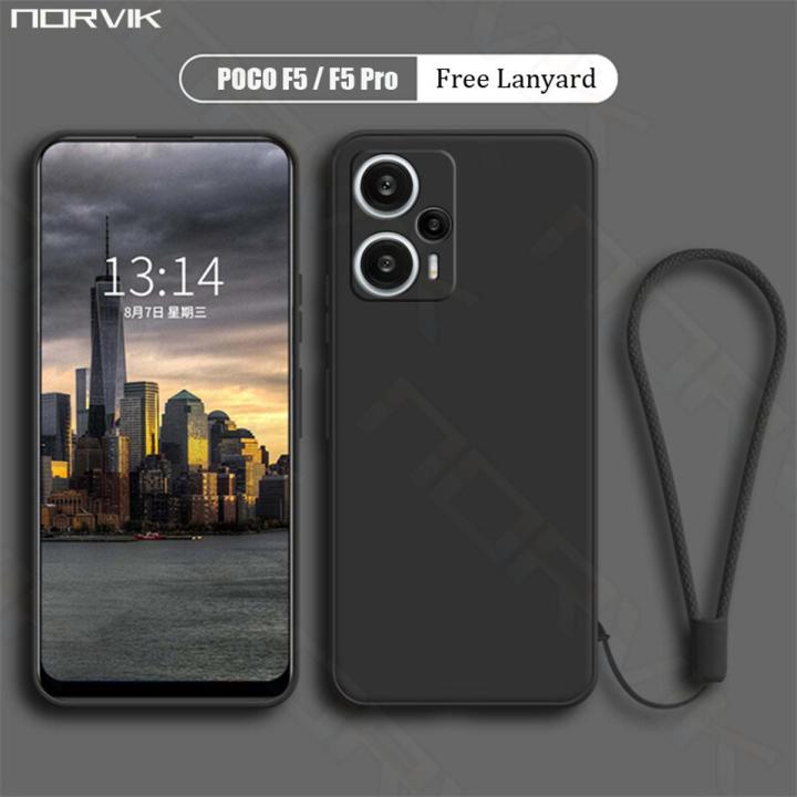 NORVIK for Xiaomi POCO F5 / F5 Pro 5G Phone Case Lens Protection Casing Solid Straight Edge Liquid Silicone Soft TPU Back Cover with Lanyard