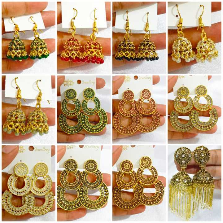 One pair of traditional multicolor jhumka earrings drop earrings for women and girls, Pakistani ethnic alloy Jhumki oxidized ear wear golden silver ball pearls studded earring jhumki antique design for party and wedding ceremonies