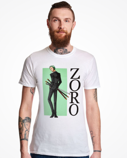One Piece – Zoro's Legendary Duel T-Shirt in White Featuring the Fearless Roronoa Zoro in an Epic Battle Stance with His Signature Three-Sword Style, High-Quality Graphic Print with Crisp, Bold Artwork, Soft 100% Cotton Fabric, Unisex Fit for Men and Wome