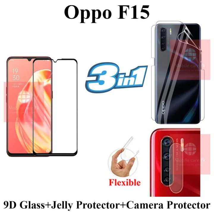 Oppo F15 Full Black 9D|5D|6D|10D|11D|21D Tempered Glass Screen Protector Full Glue Edge To Edge + Back Camera 9H Gorilla Flexible Protector + Back Jelly Protector Clear Soft Protection Film Transparent Hydrogel Film Protector For Oppo F15