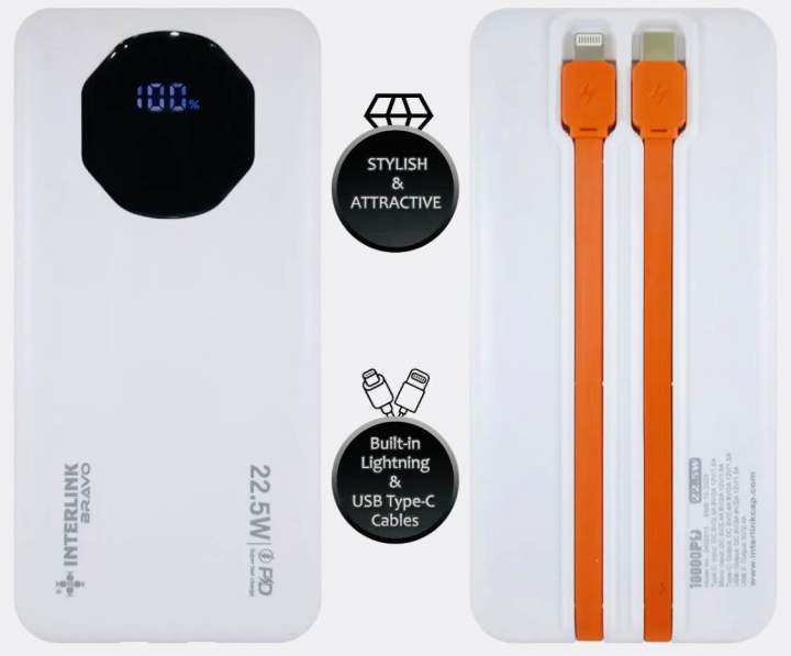 Original Brand Interlink Bravo 20000mAh Lithium-ion Power Bank, PD 22.5W Super-Fast and VOOC Enabled, Dual Input and Multiple Output Options, Built-in Cables and Smart Circuit Protection