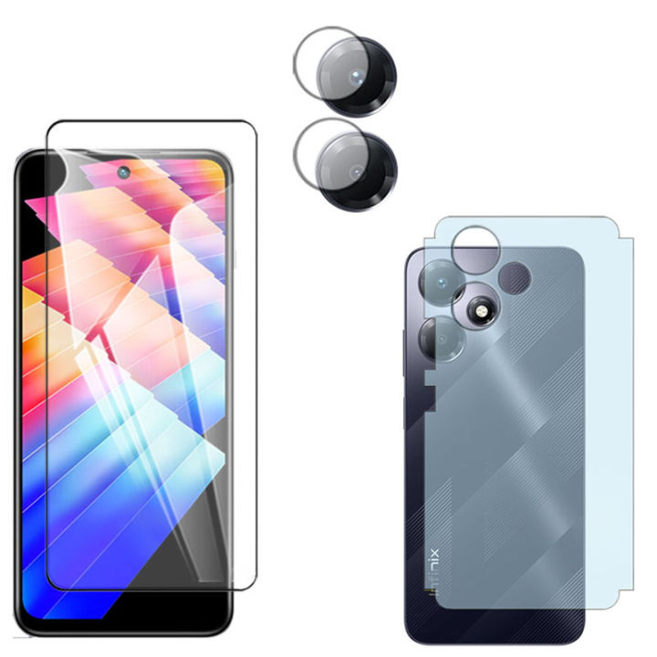 Pack of 3 - Infinix Hot 30 Play NFC Tempered Glass Screen Protector 2.5D Polish Glass+ Back Matte Protector Soft Skin Sheet Protection + Camera Glass Protector Lens Film For infinix hot30 play - Transparent