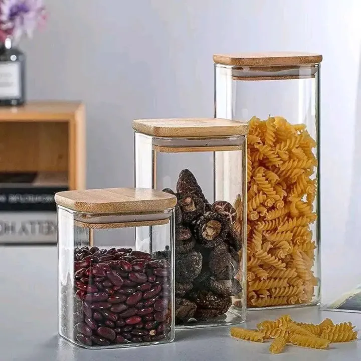 Pack of 3 Large, Medium and Small Square/Round Wooden Lid, Borosilicate Glass Jar Food Storage Containers Set, Airtight Food Jars with Kitchen Canisters for Sugar, Candy, Cookie, Rice and Spice Jars