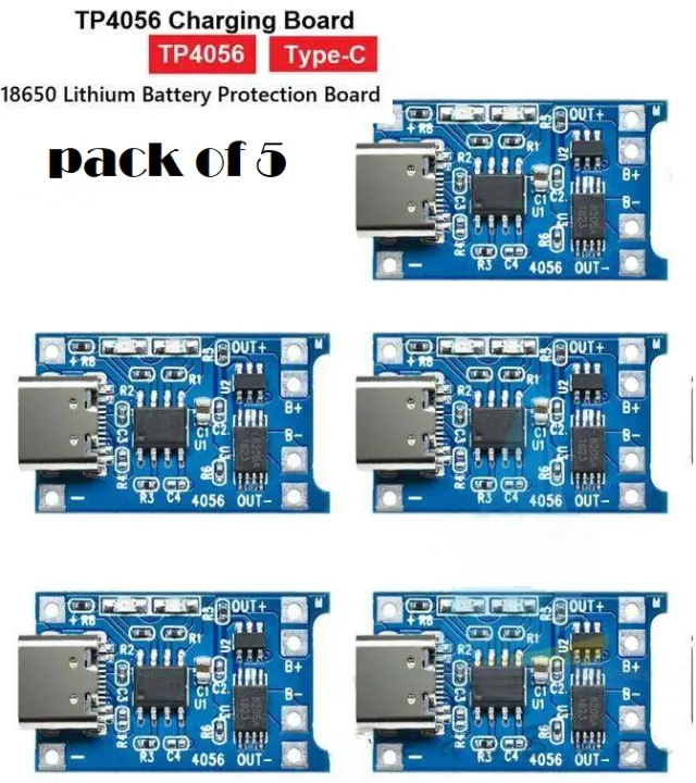 Pack of 5 TP 4056 Charging Module 1A 18650 Lithium Battery Charger Module Micro USB and Type C With Battery Protection BMS - 3.7V