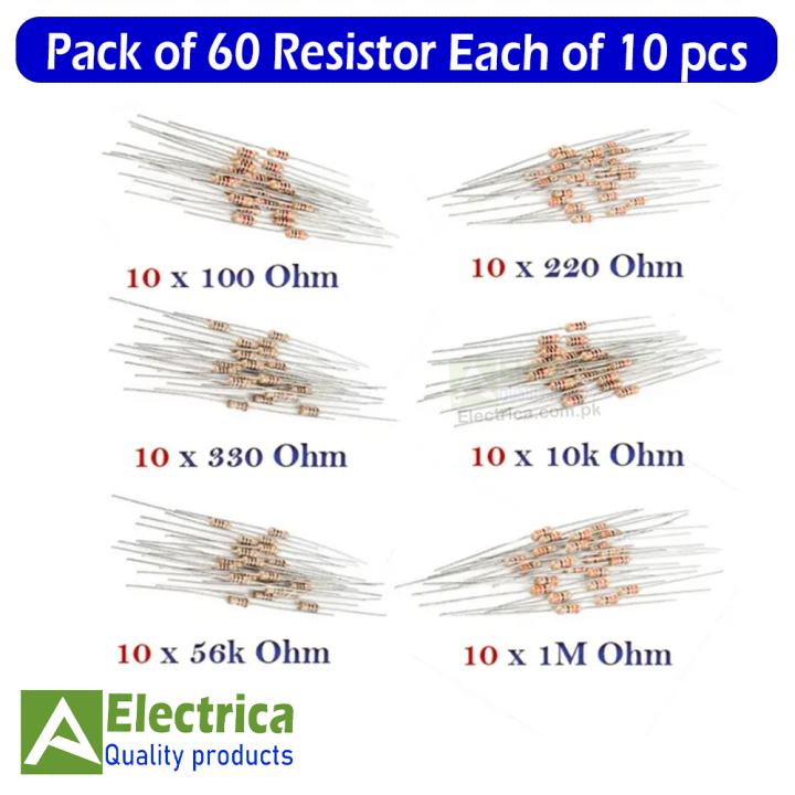 Pack of 60 Resistors 1/4W – Assorted 100Ω, 220Ω, 330Ω, 10KΩ, 56KΩ, 1MΩ (10 pcs each) Through-Hole Carbon Film Resistor Kit for Arduino, DIY Electronics & Repair by Electrica