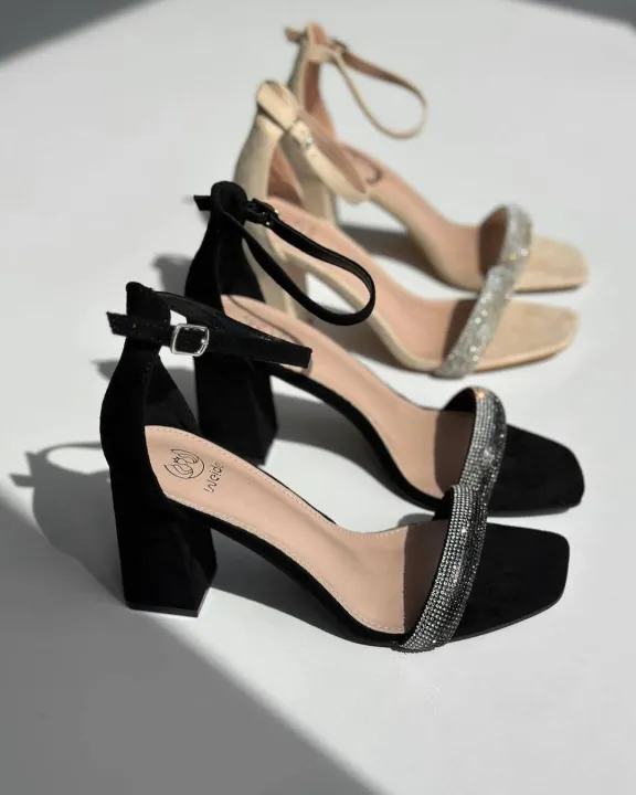 Pearl Rhinestone 3-Inch Block Heels Women’s Fashion Sandal - Faux Suede Bridal, Party, Office Shoes - Black & Beige