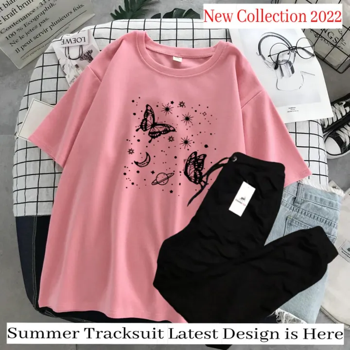 Pink Butterfly & Stars Printed T-Shirt with Black Trouser Set for Girls & Women – Sports & Casual Wear