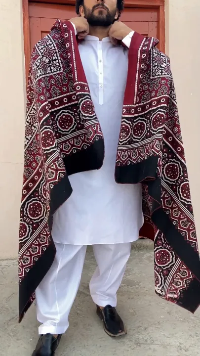 Pure Cotton Sindhi Ajrak Shawl For Men Black - Maroon - Blue
