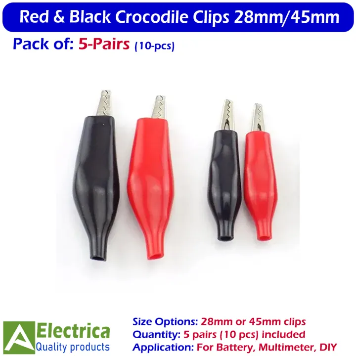 Red%20&%20Black%20Crocodile%20Clips%2028mm/45mm%20%E2%80%93%20Strong%20Alligator%20Clamp%20Connectors%20for%20Battery,%20Multimeter%20&%20DIY%20Electronics%20(5%20Pairs%20or%2010%20Pcs)%20by%20Electrica%20-%20Image%201