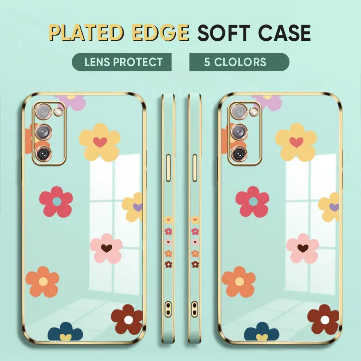 (Free Lanyard) Luxury 6D Plating Case for Samsung Galaxy S20 FE 5G / 4G Back Cover Color Cartoon Flowers Side Pattern Soft Silicone Square Phone Cases