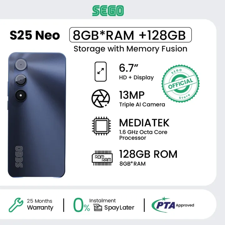SEGO S25 Neo Smartphone, PTA Approved, 6.7" 90Hz HD+ Hole Punch Display, AI Dual Camera, 5000mAh Battery, 8GB RAM (4GB + 4GB Expansion), Side Fingerprint, Dual SIM.
