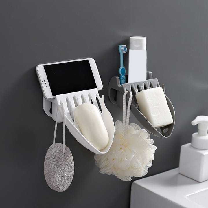 Self Adhesive Soap Dish with Mobile Holder Toothpaste Stand and Toothbrush Holder – Wall Mounted Bathroom Organizer