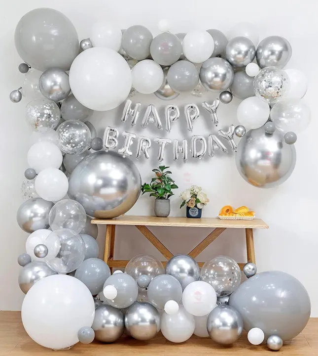 set of 62 Pc silver Birthday Decoration Kit– Silver and White Balloons Combo with Birthday Banner, Arc, Glue Dot for girls Kids Baby Birthday Decoration Items white with purple combination..whit golden combination| Birthday Decoration Combo