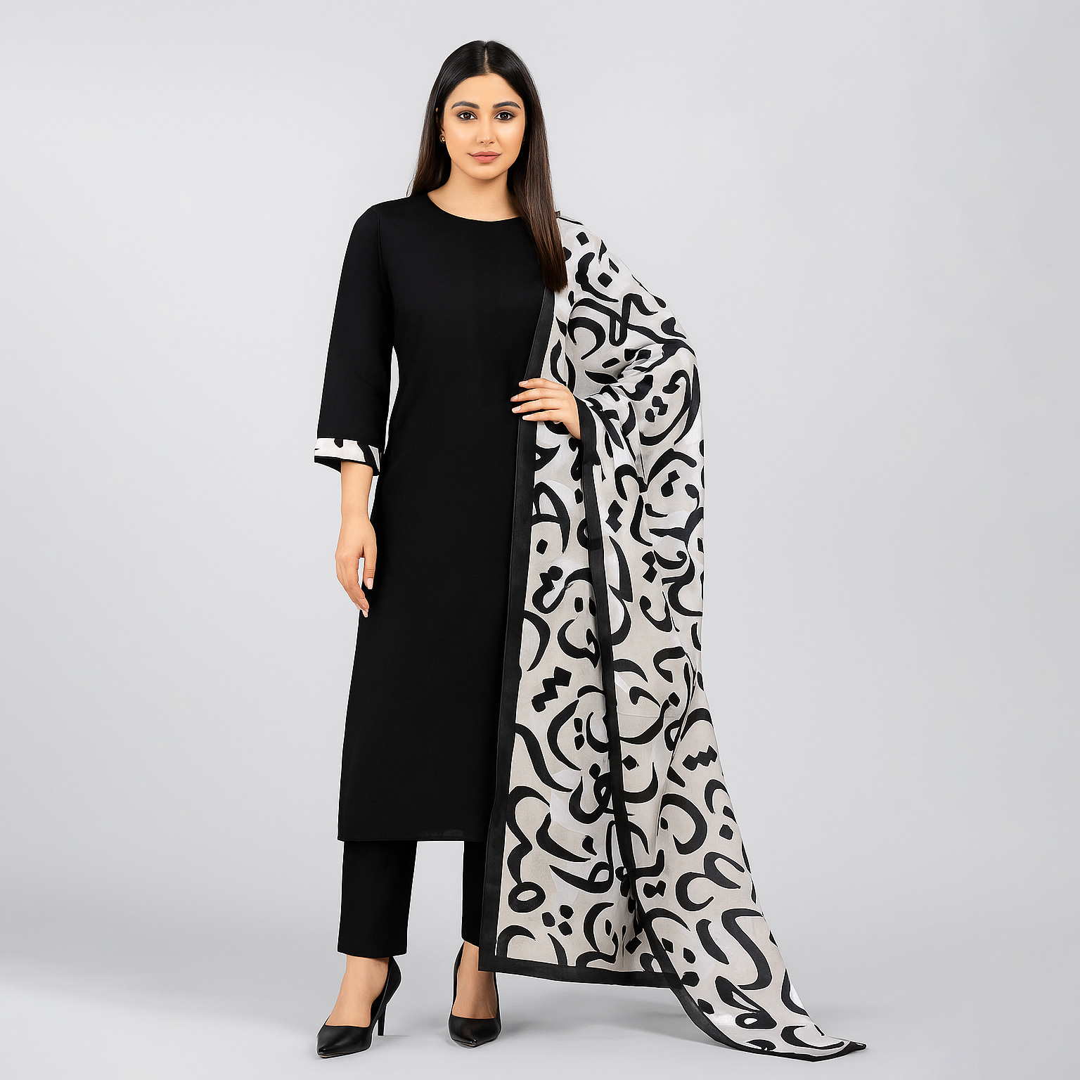 Shah%20Kamal%20Fabrics%20Unstitched%20Suit%203%20Piece%20Trending%20New%20Season%20Collection-Katan%20Silk%20Plain%20Shirt%20&%20Trouser%20with%20Calligraphy%20printed%20Dupatta%20For%20Women-Black%20-%20Image%202