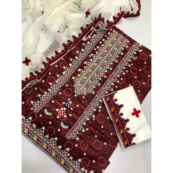 Sindhi Ajrak Embroidered lawn 3 piece Suit with Embroidered Chiffon Dupatta For Women