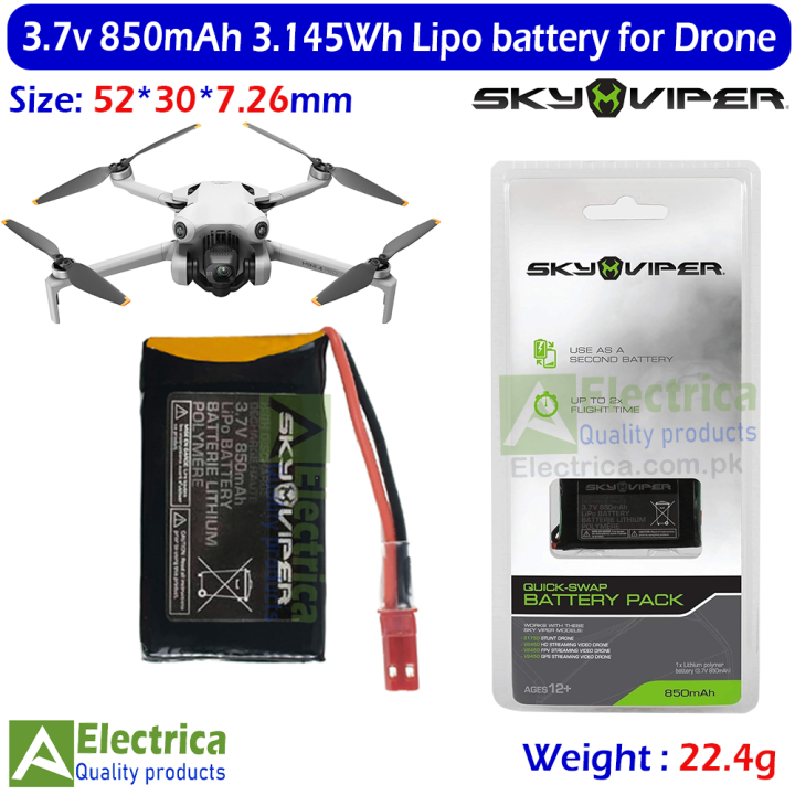 sky viper 3.7V 850mAh Rechargeable Drone Battery (With Connector) - High Power LiPo Cell for Quadcopter, Helicopter, DIY RC Toys by Electrica