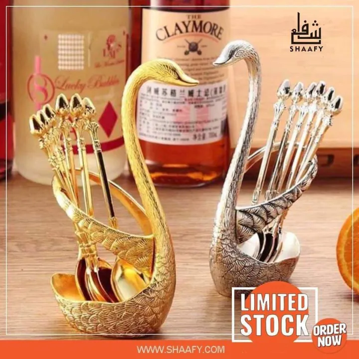 Stainless%20Steel%20Swan%20Shaped%20Tea%20Spoon%20Holder%20with%206%20Spoons%20-%20Gold/Silver%20-%20Image%201