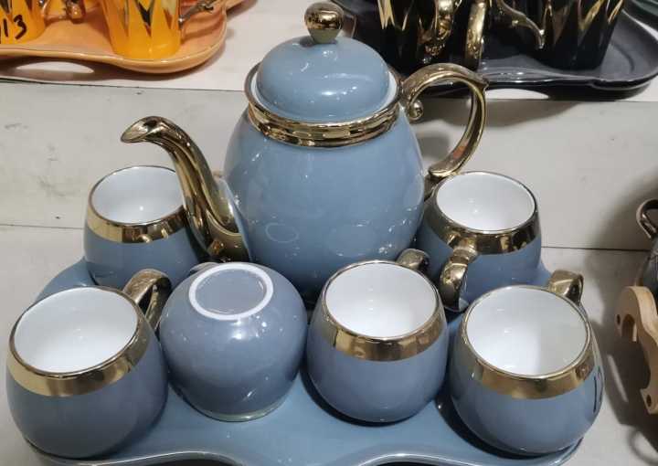 Tea Set : Tea Time Glamour: Indulge in Luxury with our Ceramic Drinkware Set – 6 Cups + 1 Kettle + 1 Tray