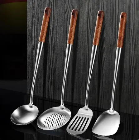 Techmanistan Stainless Steel Cooking Spoons With Wooden Handle, Turner Spatula Stainless Steel Wok Spatula Wok Spatula Ladle Skimer Ladle