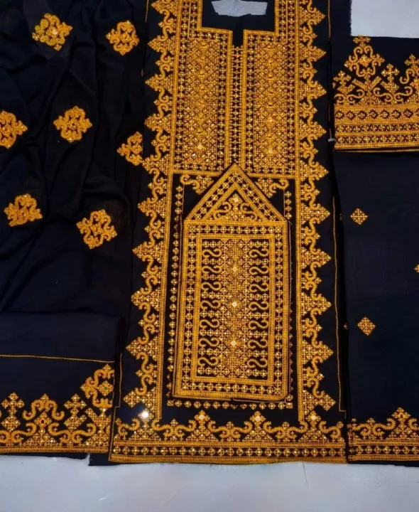 Traditional Balochi Ghagha Work: Balochi (zarra) work’ 80% similar to hand work. Description: Fully 5 pc Embroidered suit on Georgette fabric. Shirt. Front, back Fully embroidered