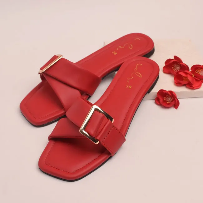 Women Fashion Luxurious Glowup Buckle Slides Style Flat Slippers, Sandal Perfect for Summer Wear - Comfortable and Stylish for Any Occasion Red, Orange