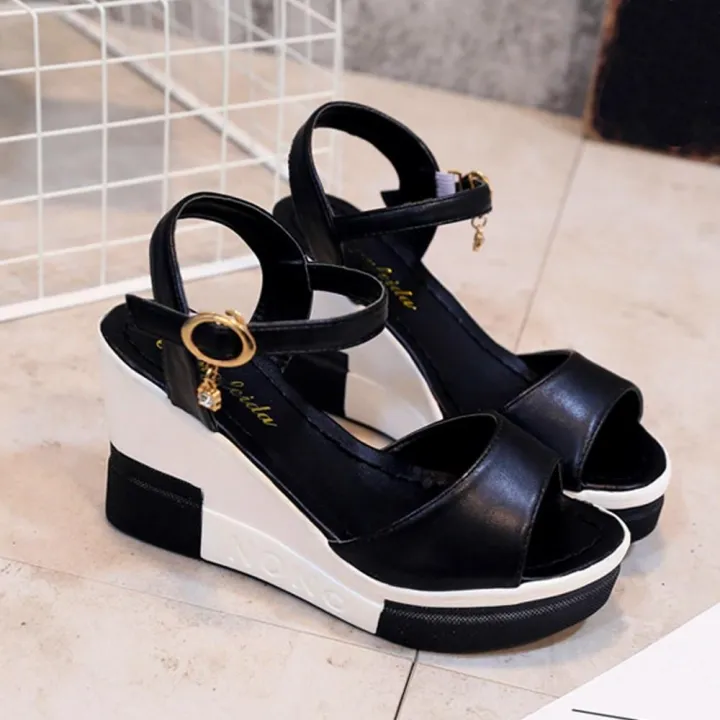WOMEN SUMMER SLOPE FISH MOUTH BLACK HIGH WEDGE SANDALS