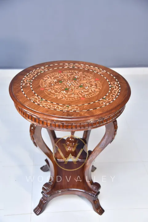 Wooden Colour Full Inlay Polish Flower Side Table-Round Wooden Inlay Side Table-Beautifully Handcrafted Antique Inlay Bedside Table-Side Table for Home Decor Purpose-Customize