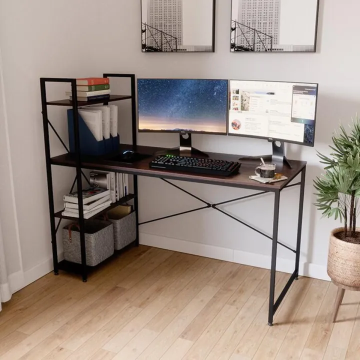 X-Base Computer Table with Smart Features - Wooden Study and Gaming Desk, Office and Home Workstation with Ample Shelf Space and Integrated Bookshelf and Tower Storage