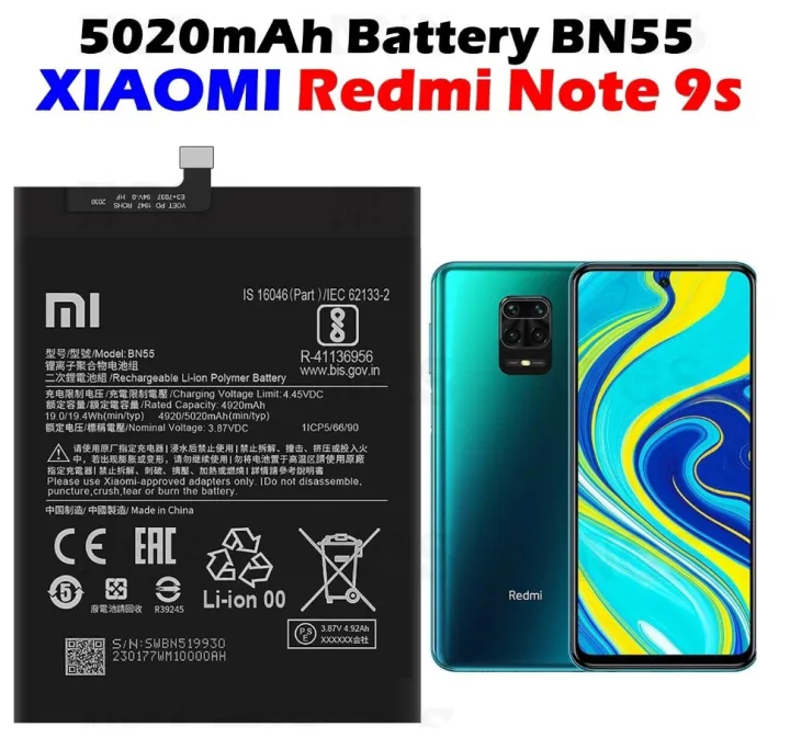 Redmi Note 9s Battery Replacement MI BN55 Battery with 5020mAh Capacity , Battery Replacement for Redmi Note 9s